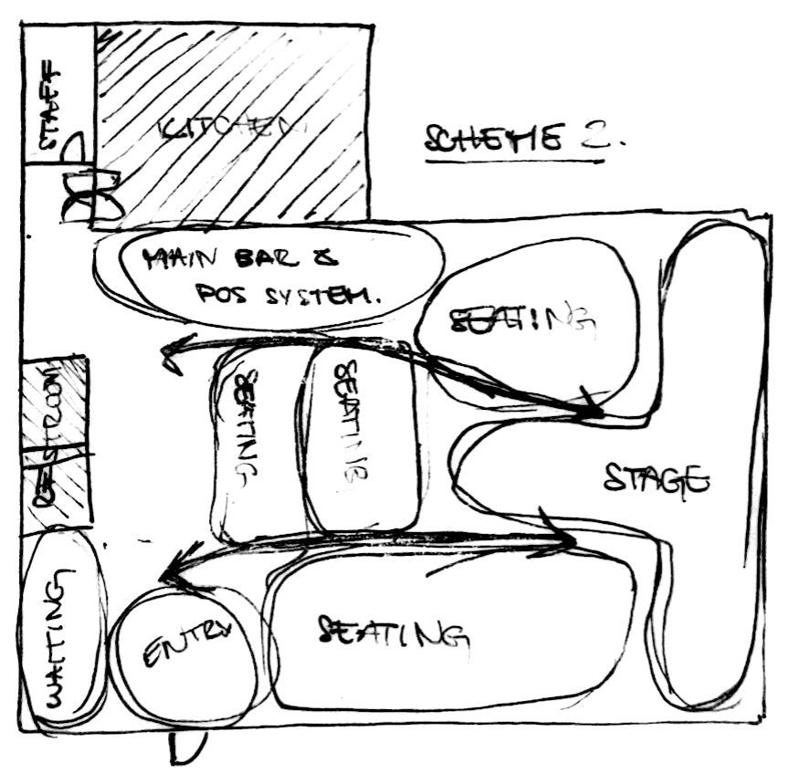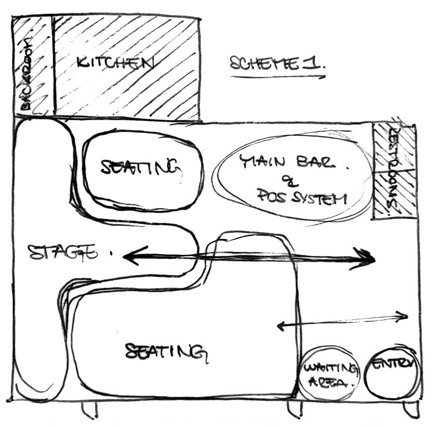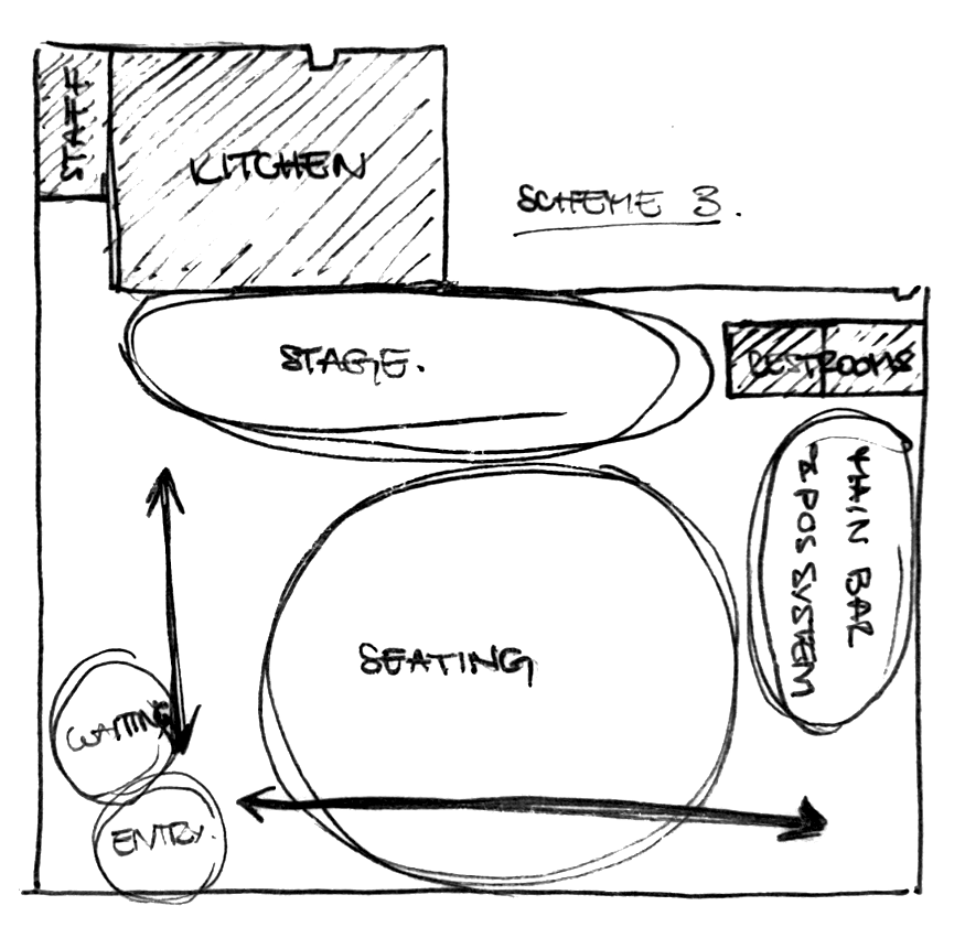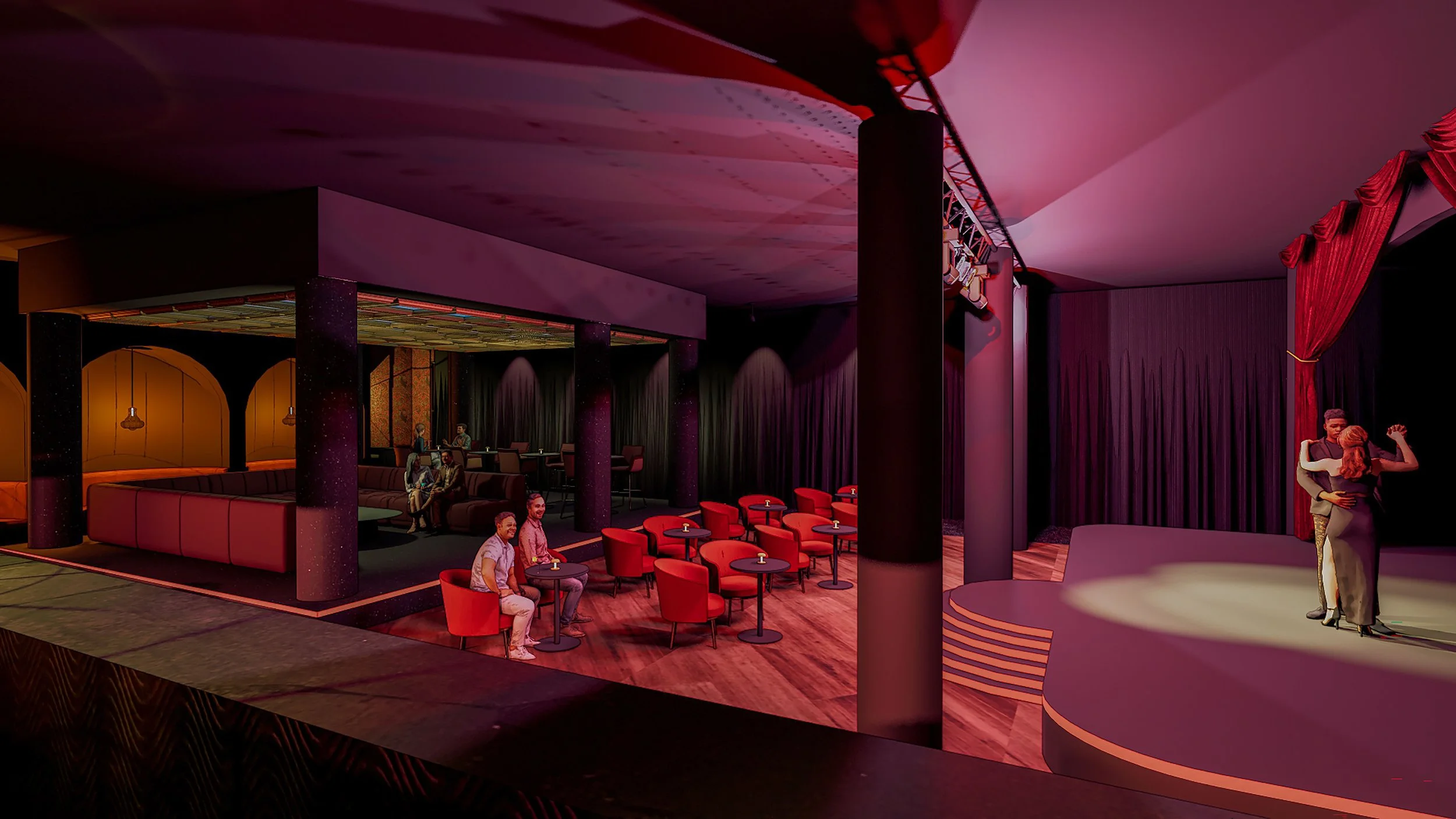 Design Concept: To create an experiential restaurant informed by the rich theatrical/performative history of Cali and the legacy of Enrique Buenaventura. Sobremesa will be organized to mimic a theater, with a seating area set up around a central stage to provide patrons the chance to fully immerse themselves in the performances.