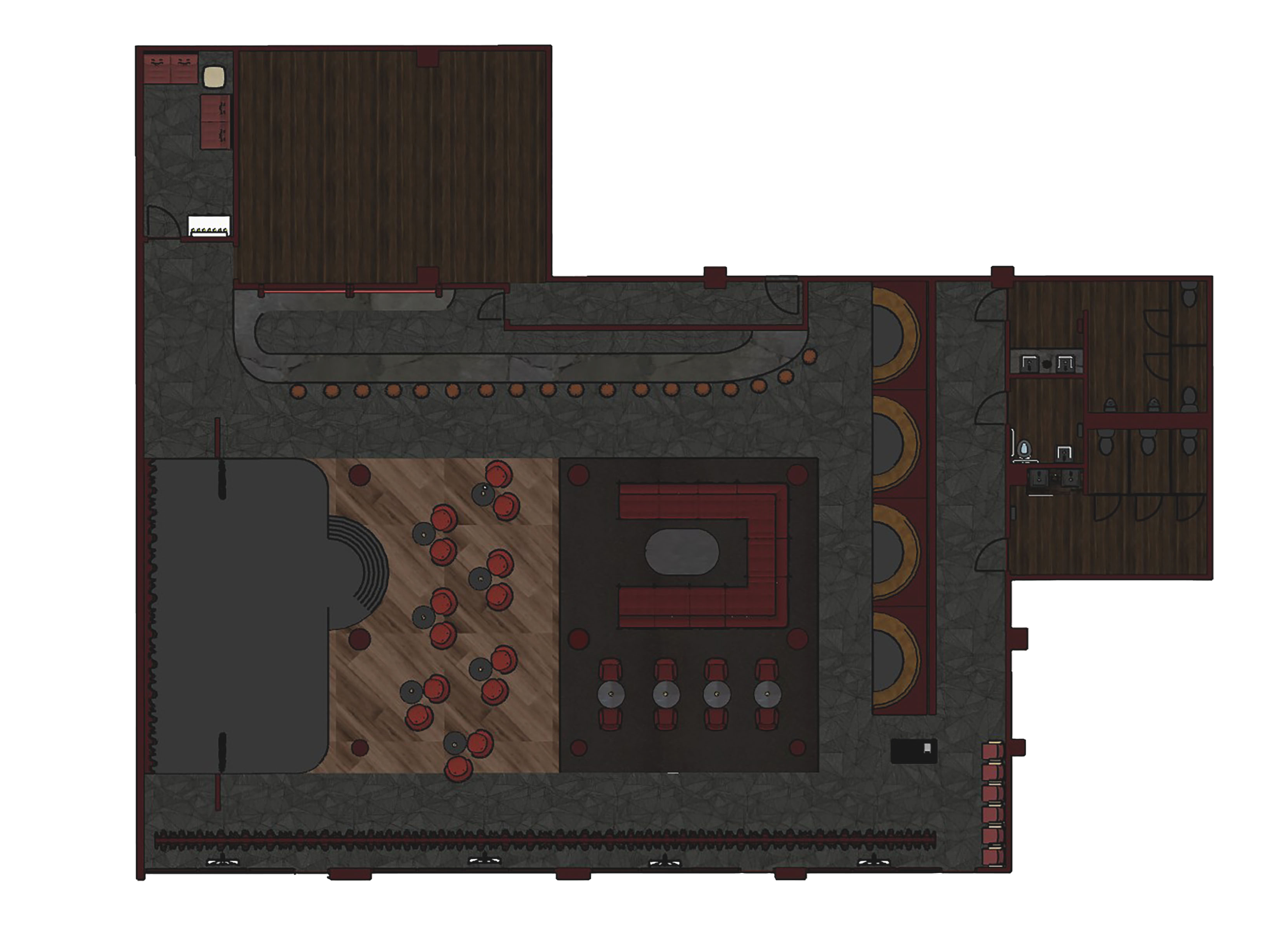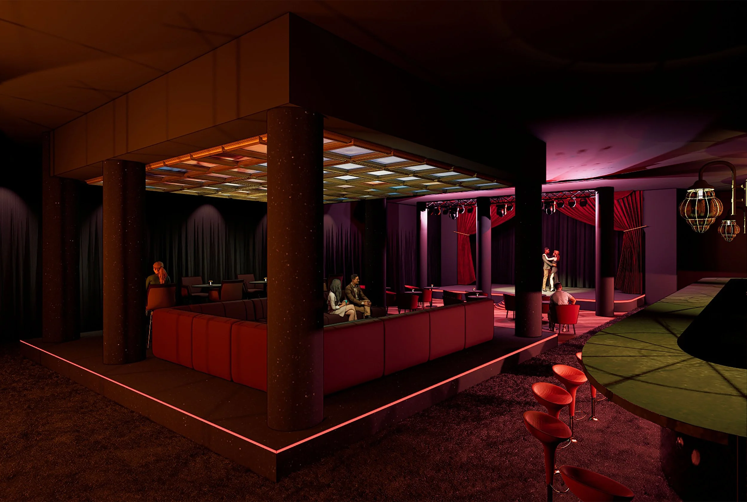 Inspiration: While researching the site, I learned that Cali has a rich history in theater and the performing arts. Besides dance, Cali is also known for revolutionizing the way Latin American theater is practiced thanks to Enrique Buenaventura's conception of the idea of "creacion colectiva." In this method, all the participants of the play (including the audience) become involved with the dramatic text and its staging. This inspired the theme behind my restaurant- a blend between a theater/performance venue and a restaurant, where patrons can enjoy their dinner with a show. Organizationally, this means that the restaurant will include a main stage, which will be in view of every seat. The dining space will be divided into different zones, each with varying opportunity for participation. Visually, the restaurant will be dark and moody, incorporating dark reds and black as well as metallics to pull classic theater design elements into a more modern look. Dim ambient lighting gives Sobremesa an intimate feel and places emphasis on the well-lit stage.