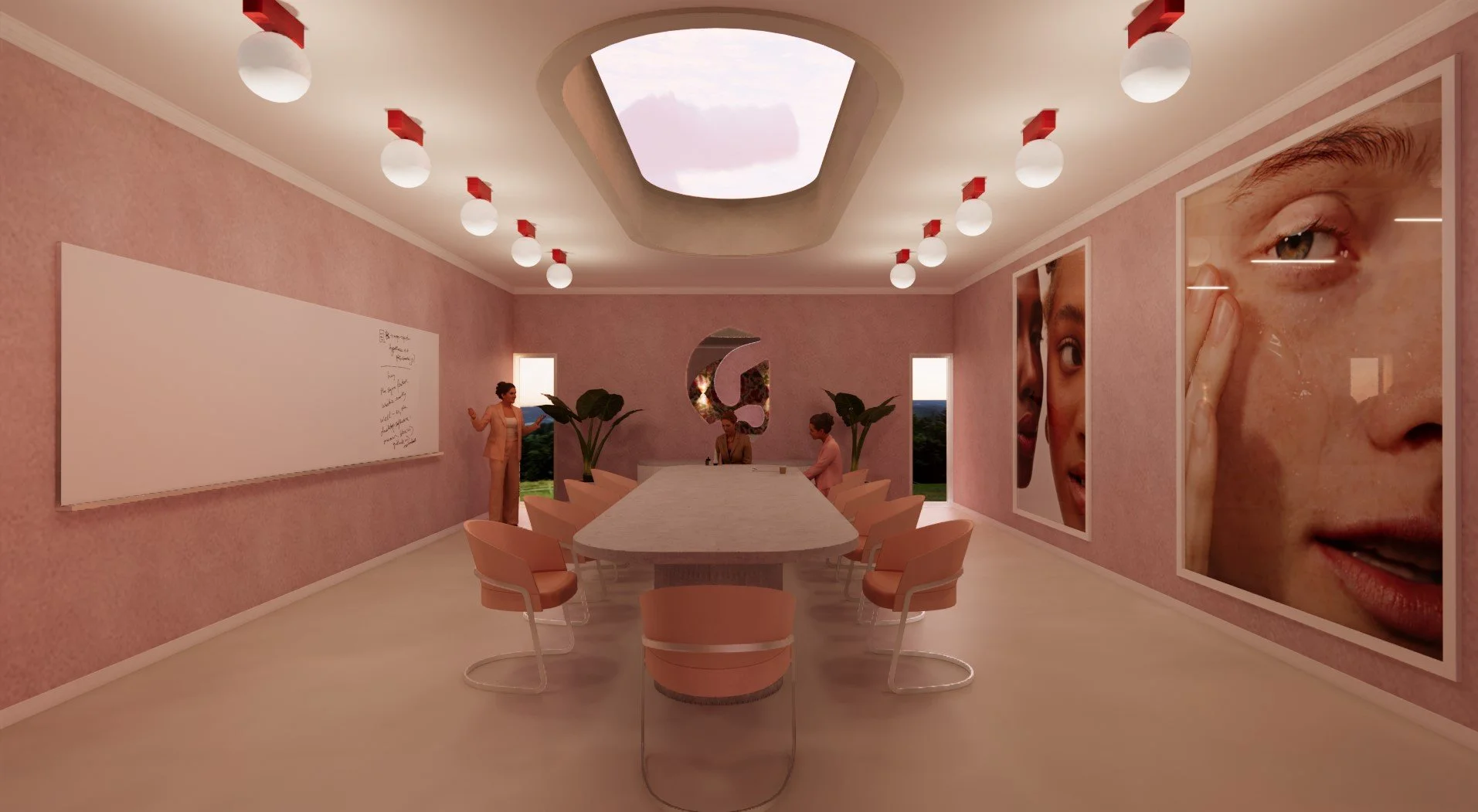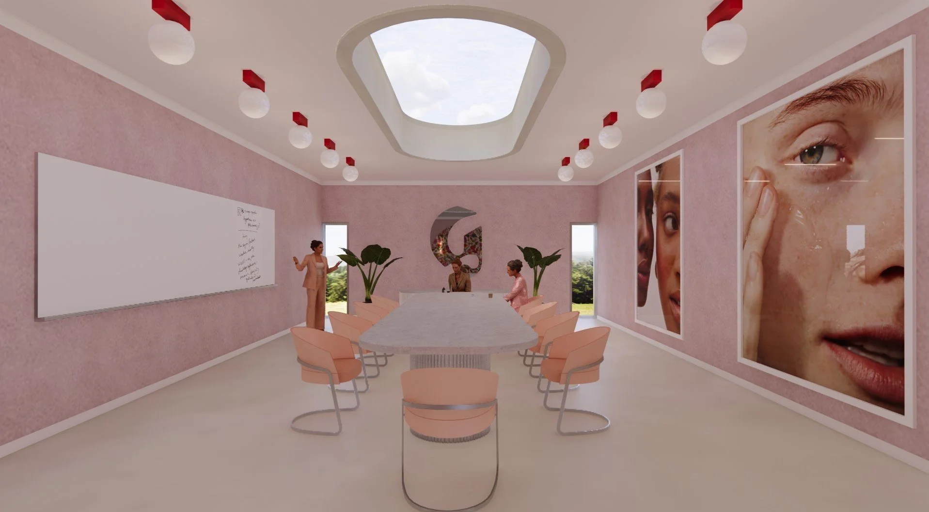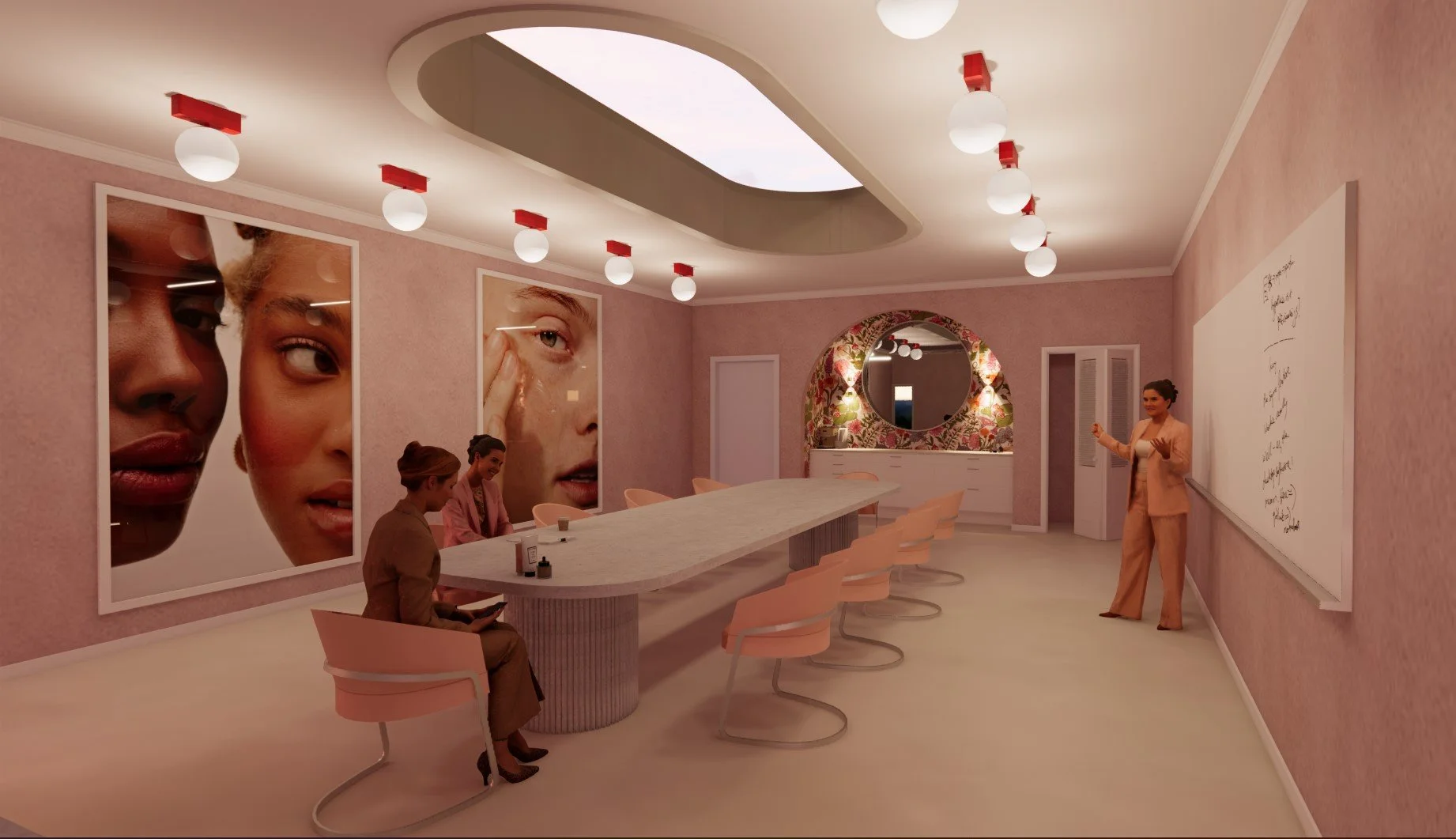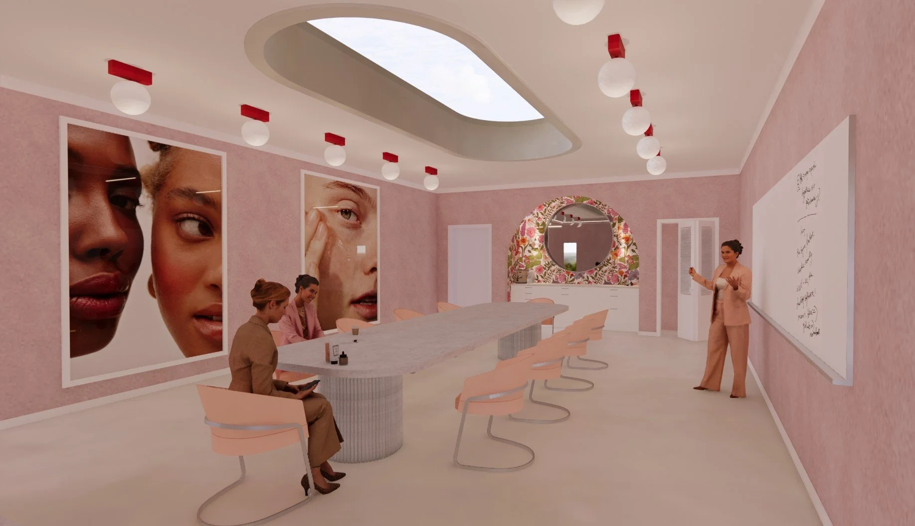 For this project, the parameters were to create a conference room and executive office based around a brand of my choosing. I chose to design for the makeup and skincare brand Glossier, a brand known for their clean, fresh, and feminine branding. I chose to incorporate a lighter color palette with pops of bright red, florals, and Glossier’s signature pink. I also included some botanicals in both rooms to add an organic element to the space and reinforce Glossier's commitment to sustainability and natural beauty. Overall, this project challenged me to think creatively and design a space that captures the essence of Glossier's brand identity. I am excited to continue exploring different design styles and techniques as I progress in my studies and career.